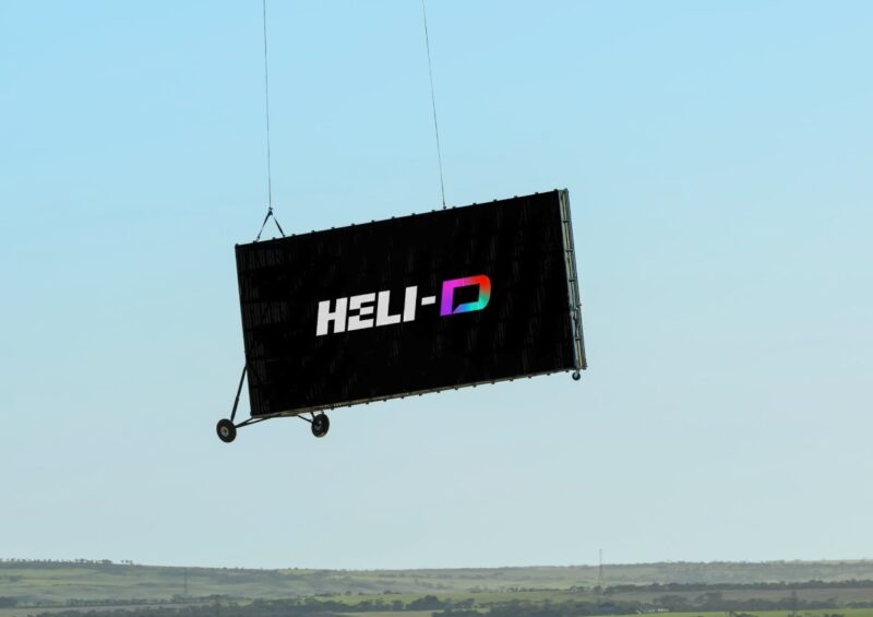 This hits me as slightly nuts, but a new digital OOH media play is using a helicopter to lift and tow around, by wire, a big, rigid two-sided LED display that is readily visible to people on the ground.