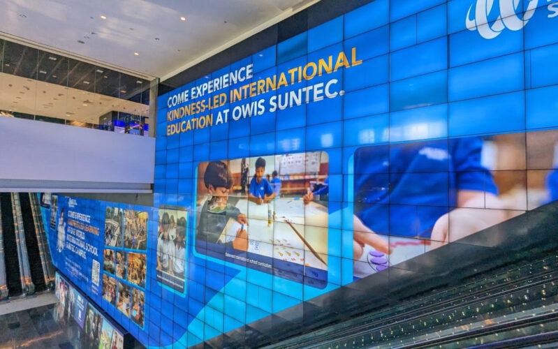 The Suntec conference and shopping center in the heart of Singapore features an impressive open entrance area. Eight escalators lead from the driveway to the conference center on the third floor. Plenty of space for a digital canvas – that’s what the operators and LG thought over ten years ago. The idea of a record-breaking video wall was quickly born in Korea and Singapore. For this purpose, 664 LG seamless displays (55″) were combined to form a three-story high and 60-meter-wide video wall. A content concept was developed by the Korean agency Minydesign.