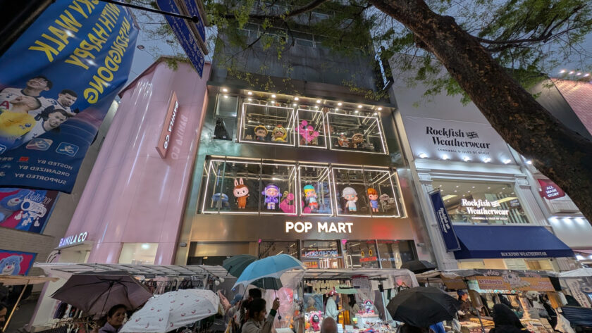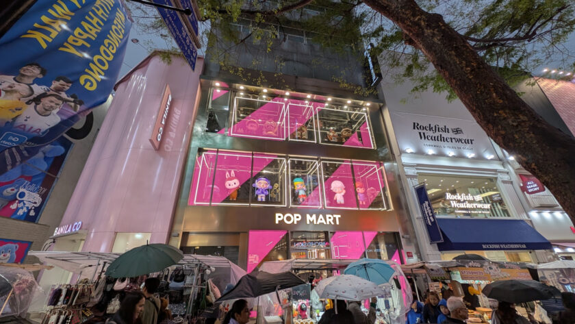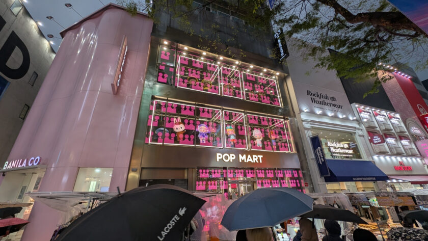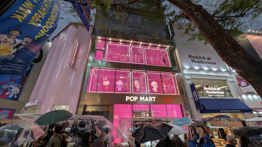Seoul | A visit to the Chinese retailer Pop Mart – known for its pop culture and designer toys – is the highlight of every Gen Z city trip. Originally known for its 1,000+ vending machines throughout Asia, Pop Mart also operates several flagship stores. This includes South Korea, where the brand set up shop in the Myeong-dong shopping district with a remarkable transparent LED facade.
