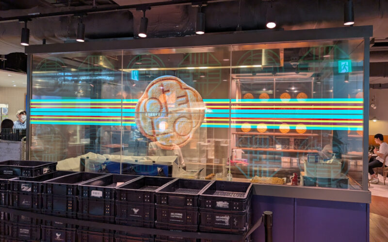 Where else, besides trade shows or showrooms, do you get to see a video wall made of ten transparent OLED screens? In this shop, the live bakery in the middle is surrounded entirely by these see-through displays. The content played on them isn’t particularly exciting, but it does play around with the screen’s transparency in some clever ways.