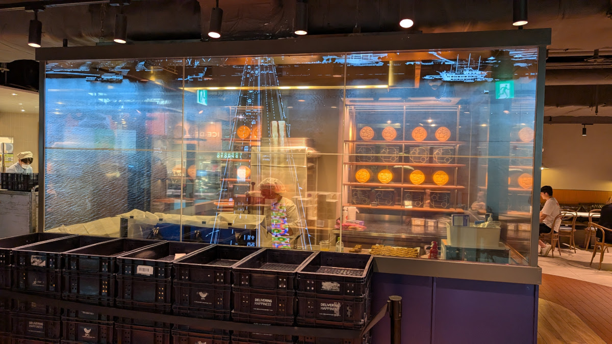 Where else, besides trade shows or showrooms, do you get to see a video wall made of ten transparent OLED screens? In this shop, the live bakery in the middle is surrounded entirely by these see-through displays. The content played on them isn’t particularly exciting, but it does play around with the screen’s transparency in some clever ways.