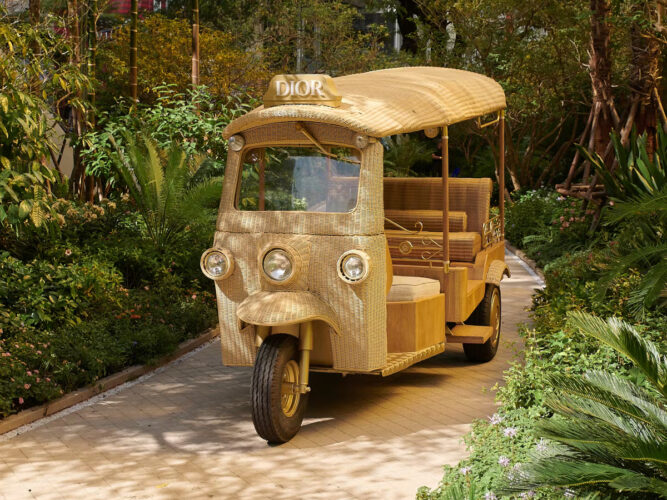 Mirrored surfaces on the inside of the façade reflect the sky and surroundings, creating a multi-dimensional canvas where Bangkok’s tropical fauna blends seamlessly into Dior’s golden elegance. It’s spectacular as a rare fusion of retail and architecture.