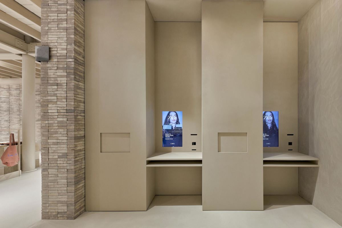 Zara has introduced an “Apartamento” in its renovated Madrid store, combining a furniture showroom, café, and fashion display. Digital signage is subtly integrated throughout the space.