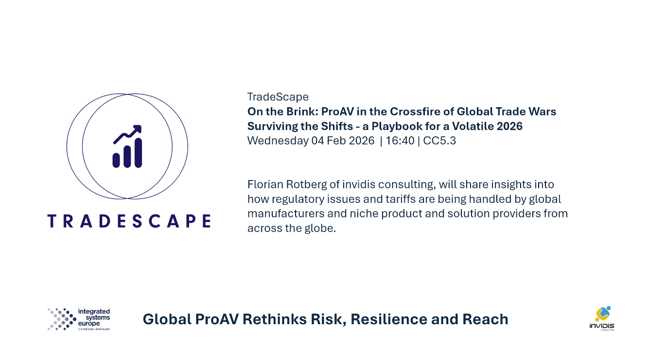 Join invidis’ Florian Rotberg at ISE 2026 CC5.3 for Regulation and Tariffs: On the Brink – ProAV in the Crossfire of Global Trade Wars on ISE-Wednesday 04 February at 16:40h