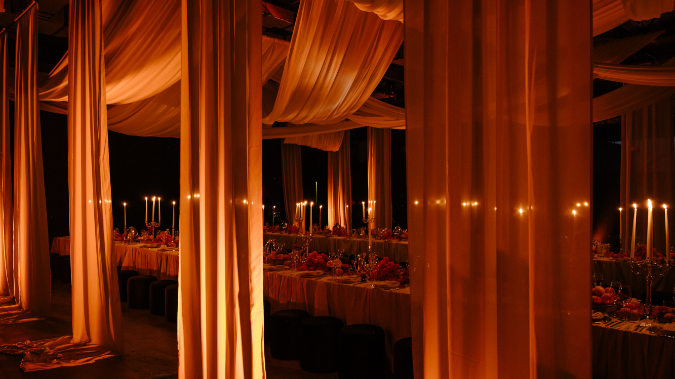 M-Cube developed a projection-based installation for the event, using high-quality projectors to illuminate textile drapes from precise angles. This technique transformed the drapes into dynamic surfaces shaped by light and movement, balancing visual sophistication with the intimate nature of the dinner.