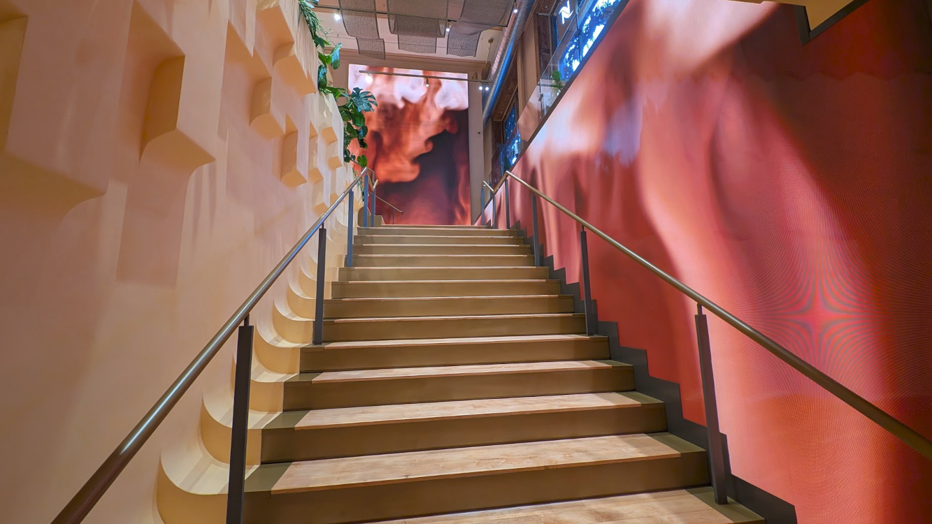 The most striking media installation is found in the stairwell connecting both floors. Here, a large-scale ambient LED installation extends from ceiling to floor, displaying animated coffee-inspired visuals. The installation functions less as a screen and more as a spatial element, enhancing the emotional transition between retail and experience zones.