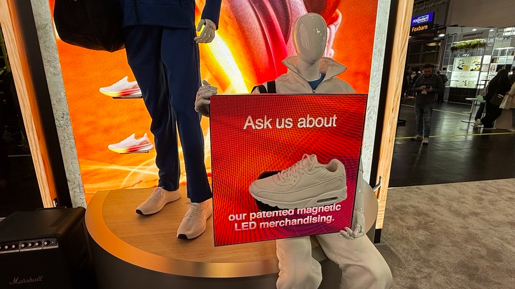 One of Outform’s highlights at Euroshop is a project developed for a global sporting goods brand: a flexible LED retail display system using magnetic shoe shelves. Instead of relying on fixed hole matrices or predefined shelf grids, the magnetic holders allow merchandise to be placed anywhere on the LED-surface.