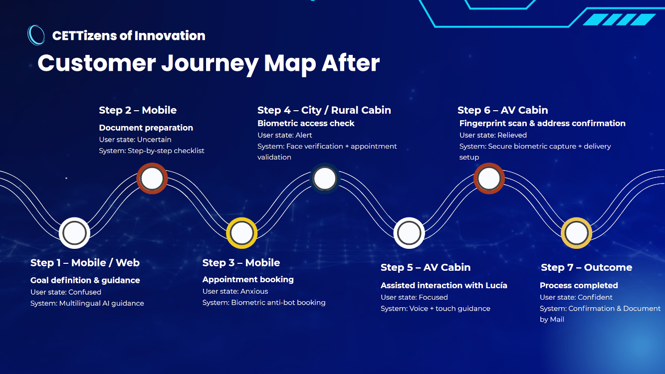 The winning project LUCIA was developed by “CETTizens of Innovation” – a team of students from UB CETT Barcelona School of Tourism, Hospitality and Gastronomy. The students addressed a problem very relevant for non-EU residents in Spain: the complex annual process of applying and renewing the resident permit. The process requires multiple visit to government offices, while precious time slots are more or less only available on the black market for 50-500 Euro.