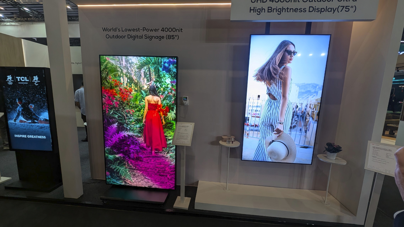 - 85″ Ultra‑Efficient 4,000‑nit Window Display – with only 395W average power consumption, this is according to TCL currently the world’s most energy‑efficient high-brightness signage display in its class.