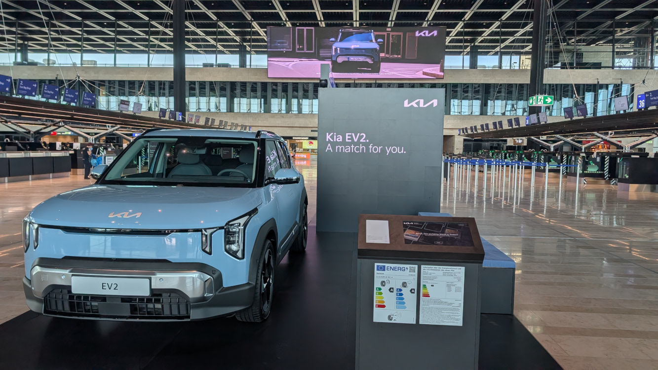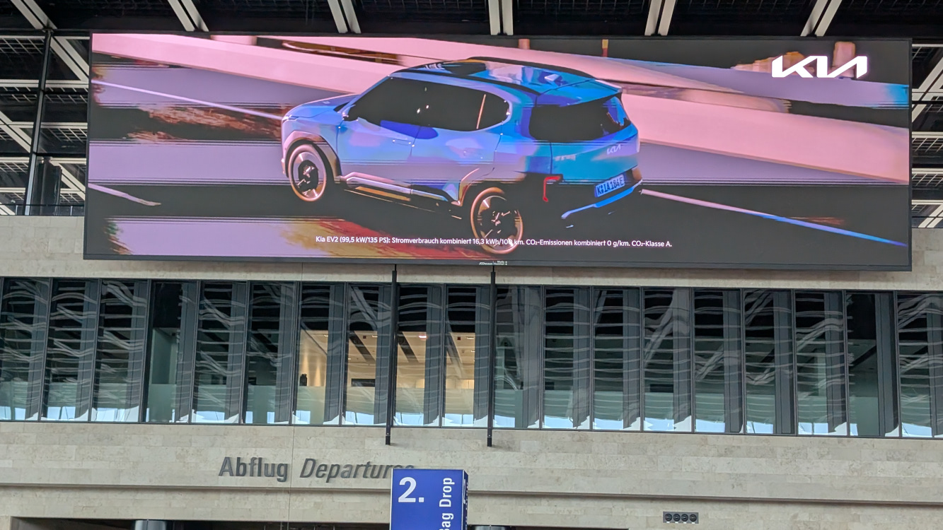 Upon entering the check-in hall, passengers are greeted by the “Digital Check-in Icons”: two large LED screens, each 120 square meters in size, supplied by M-Cube. Visible from almost every angle, they are complemented by adjacent promotional areas. At launch, Kia is using this prime location to showcase its EV2.