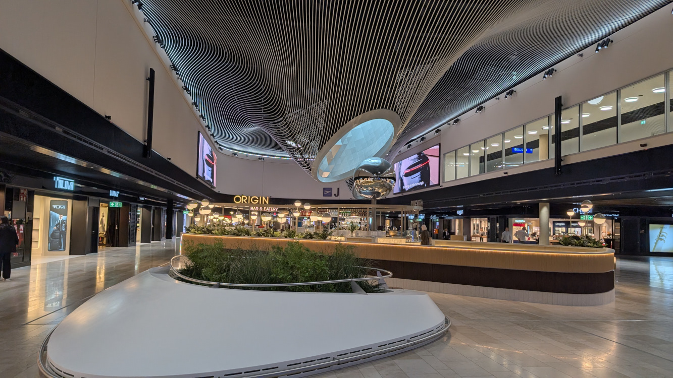 The retail zone – the airport’s central “marketplace” – is also defined by two prominent digital surfaces, each measuring 60 square meters. The LED technology is provided by LG, while planning and integration were handled by Ben Hur. Positioned at a lower height, these displays use a finer 2.5-millimeter pixel pitch for improved image detail. Media Frankfurt markets them as “Digital Plaza Stars,” with Honda and Lumas among the first advertisers.