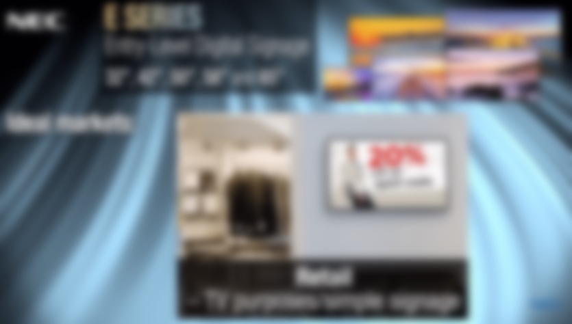 “The new E Series displays give users an easy way to get digital signage up and running quickly,” said Keith Yanke, Senior Director of Product Marketing at NEC Display. “With the growing appeal of video, these dynamic digital signage displays give users more creative options for content. Small businesses and other organizations now have a prime opportunity to use digital signage to advance their business and branding goals. NEC’s commitment to helping businesses realize the benefits of digital signage is unparalleled.”