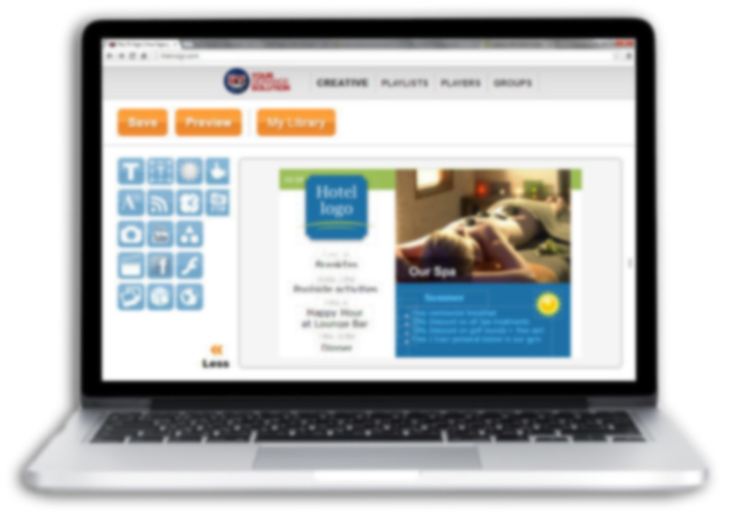 The SaaS-based product uses little Android HDMI sticks that will plug into the back of pretty much any flat panel display via the HDMI port. The system uses drag and drop tools for creating and scheduling content, and like many platforms handles things like RSS feeds and social media integration.