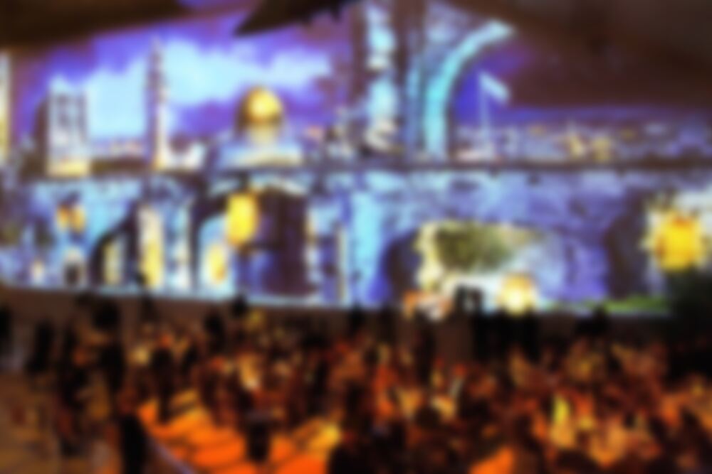 The evening started with a cocktail party with guests walking into simulated versions of the Qumran Caves where the Dead Sea Scrolls were discovered. Guests then left the caves, making their way down the escalator where they then experienced the stunning projection mapping display in the large dining area.