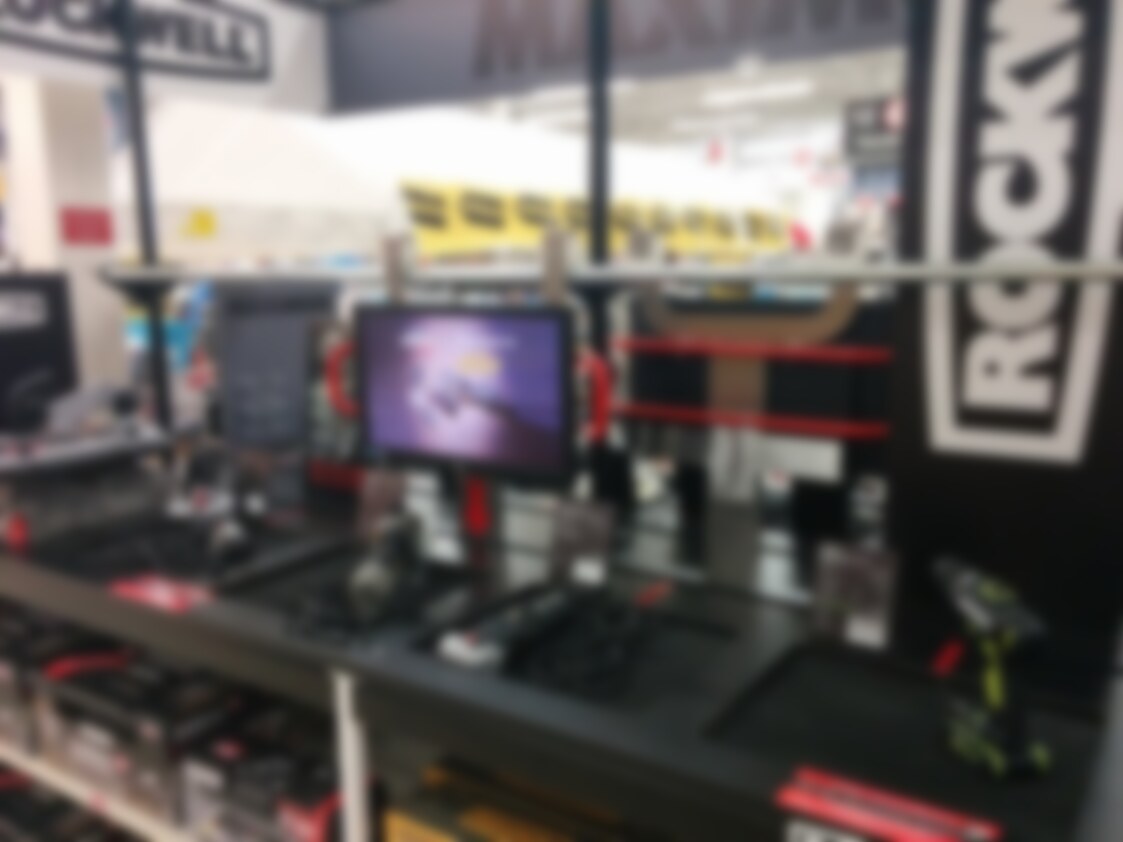 Here’s an interesting digital merchandising set-up I bumped into at my local Canadian Tire store – a big dedicated store within a store zone for the power tool maker Rockwell.