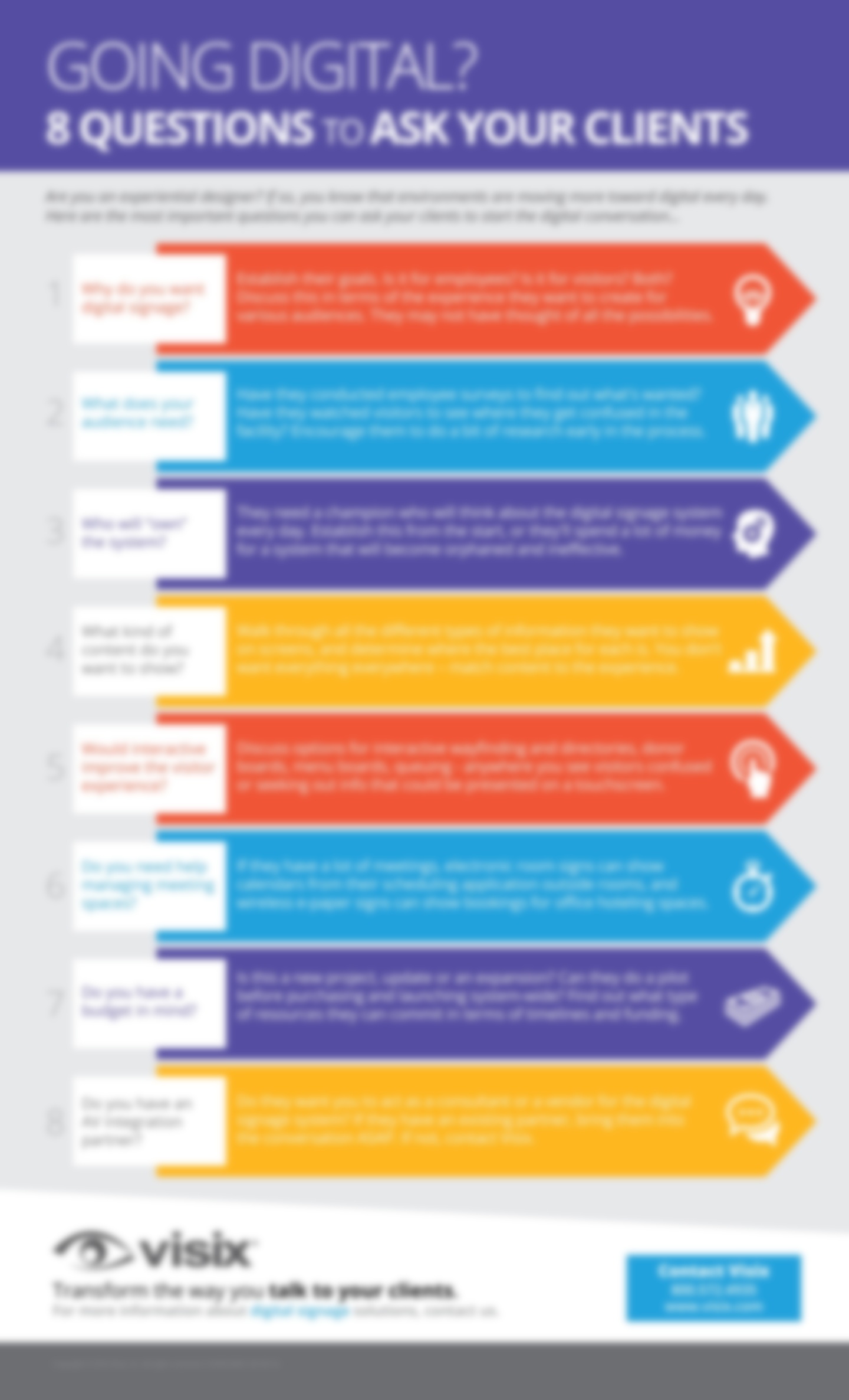 Whether you’re an AV/IT integrator, architect, consultant or experiential designer, you probably have clients considering digital signage, but unsure of how to get started. Here are eight questions you can ask that will help focus the conversation and make sure they get exactly the right deployment for their needs: