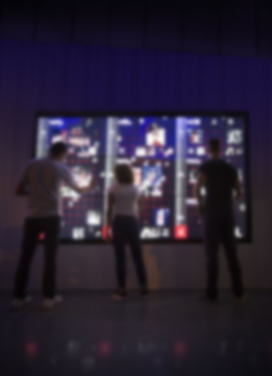 Programming for The Interactive Timeline’s touch screen is divided into thirds, where each section responds independently to user input. “The Interactive Timeline posed some serious technical challenges,” explained Austin Mayer, Leviathan’s interactive director. “Displaying hundreds of images and videos simultaneously, while maintaining a high frame rate and responsive touch input, required some advanced wizardry. We were able to optimize the experience using GLSL, the official OpenGL Shading Language, using our design weapon of choice: Derivative’s TouchDesigner.”