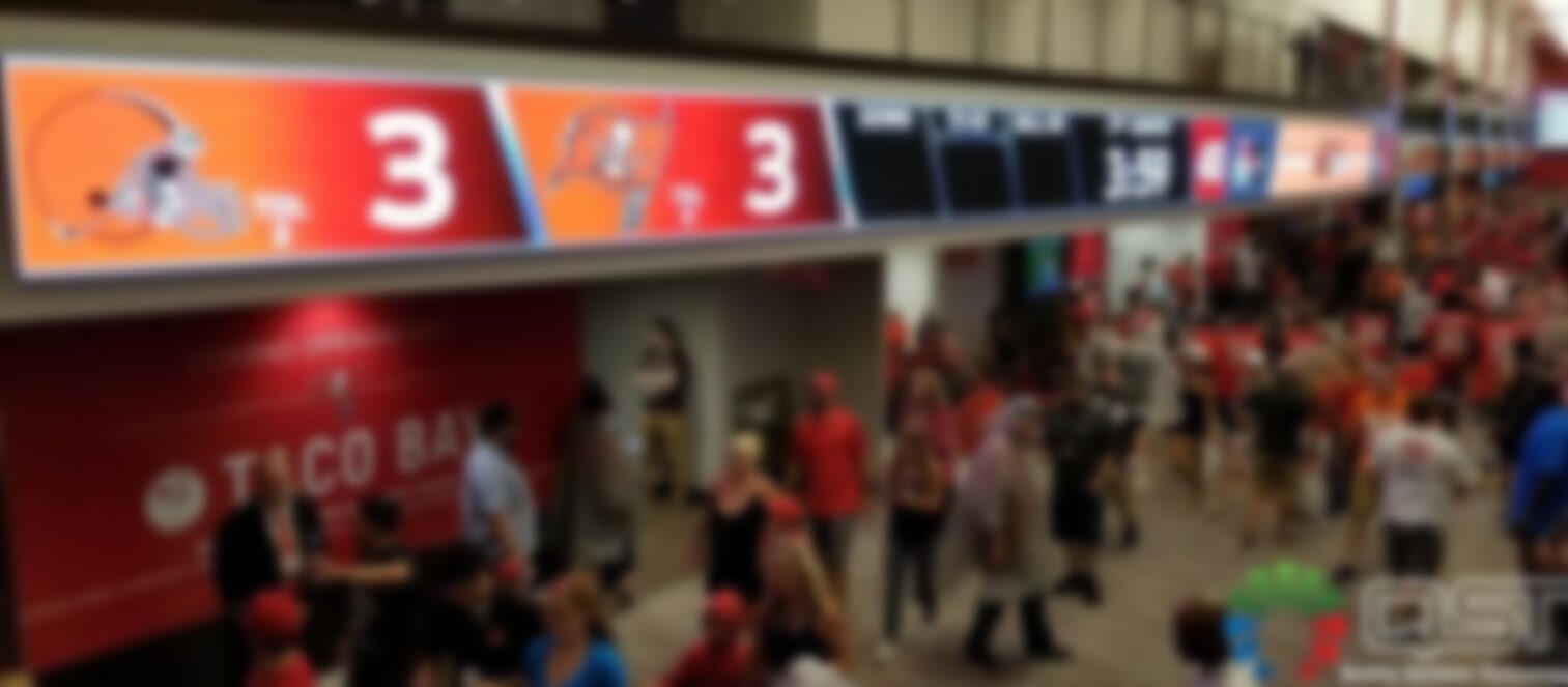 This is the concourse at Raymond James Stadium, home to the NFL’s Tampa Bay Buccaneers. Salt Lake City-based Quality Systems Technology North America, or QST, has just finished installing a curving 121-foot wide by 3.15-foot tall 2.5mm pitch LED banner in the “Ray Jay” – in time for the new season.