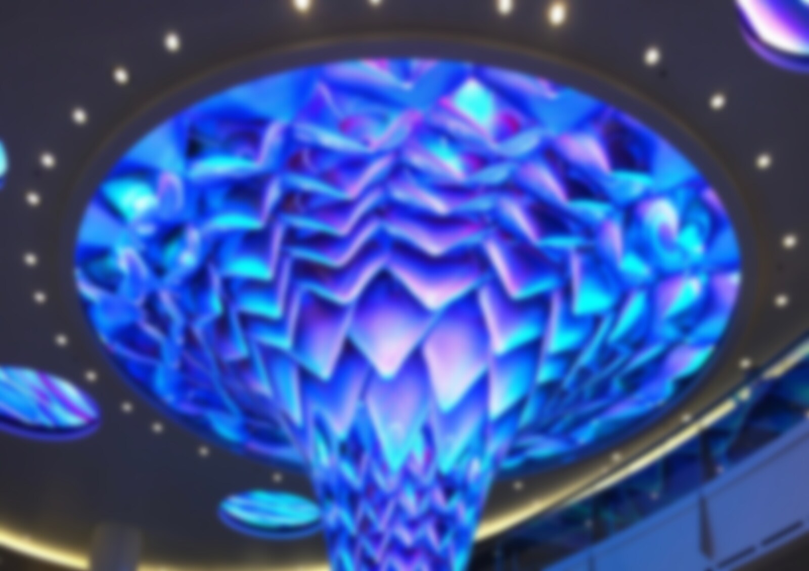 This is a 25 foot tall vortex-shaped LED column in the atrium of the Carnival Vista, a ship in the Carnival cruise line fleet that first set sail a year ago. It has a diameter of 2.5 feet at the bottom, increasing all the way to 26 feet at the top. Called Dreamscape, the digital art piece runs a series of motion graphic visuals on a 6mm pitch curved canvas.