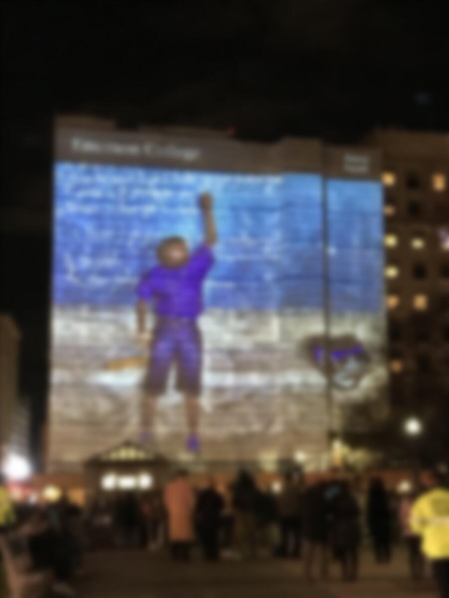 A college building on the corner of Boston Common has a big, white tarp covering the facade for the next 18 months – as it undergoes rears and renovations – so that very large piece of cloth has been turned into a massive projection canvas.