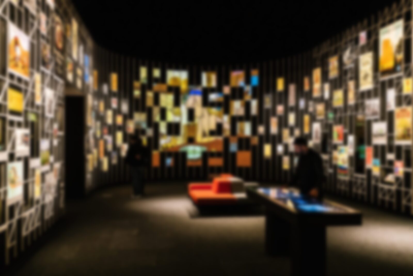 The program was put together by Philly-based interactive shop Bluecadet. In the top photo, the video wall mosaic is at the rear and the visuals on the sides are print.