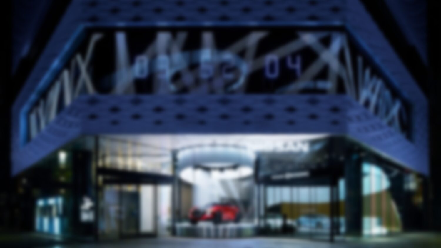 The feature car turntable at the base has LED strips on the circular glass wall, and above the street on the second level, transparent LED mesh screens span the full length of the windows, running ambient content.
