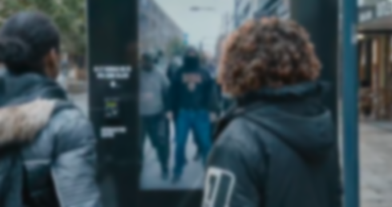 The fundraising campaign shows a bunch of white power thugs, on a street furniture screen, approaching people and chanting their nasty bile. That stops and they disperse when viewers pull out some sort of payment card and make a donation.