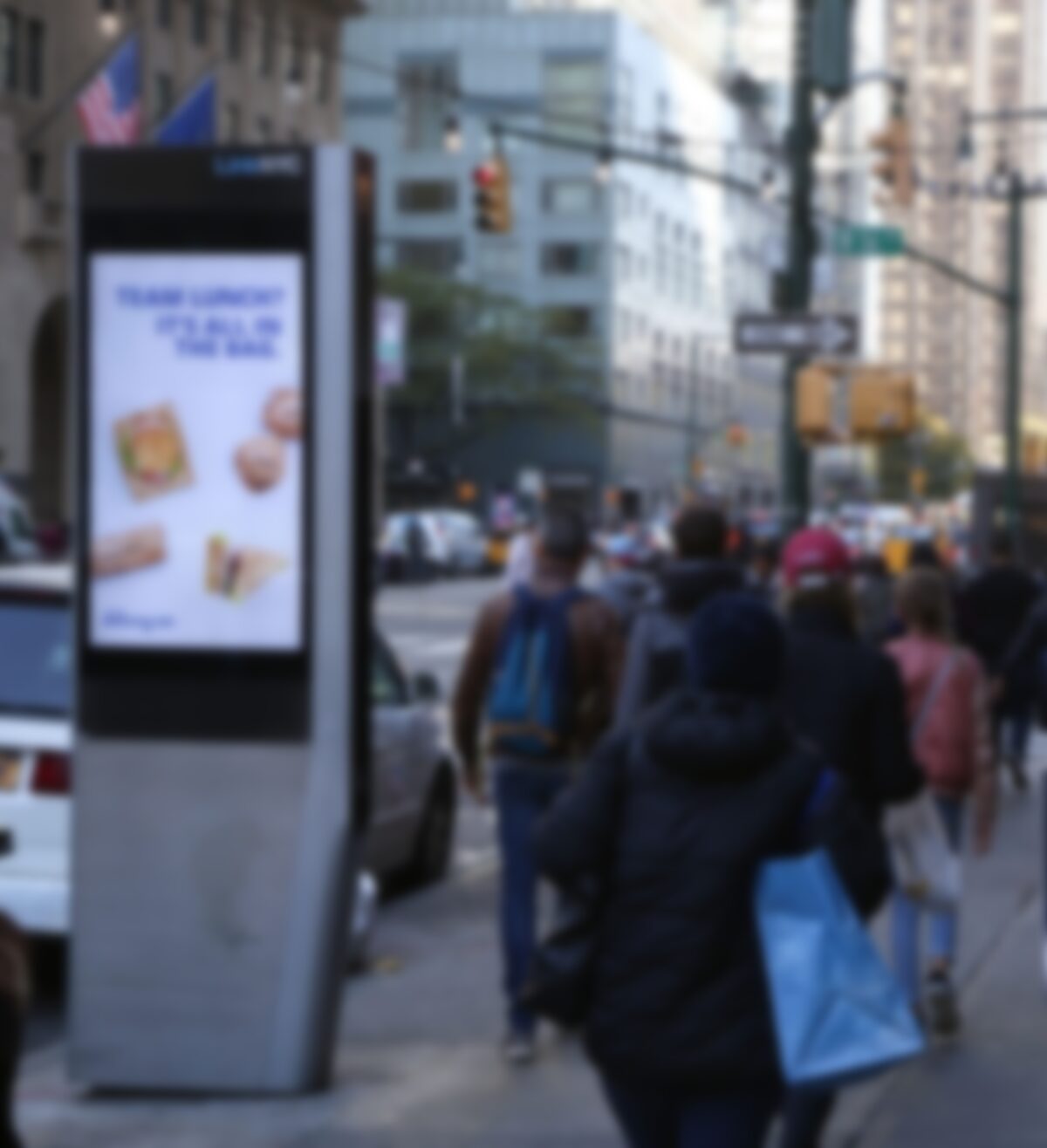 The hyperlocal campaign is running on Intersection’s LinkNYC network, which is big 55-inch back-to-back screens on monolithic sidewalk fixtures. The targeting tactics are based around things like calls to action for delivery, around lunchtime, near office towers.