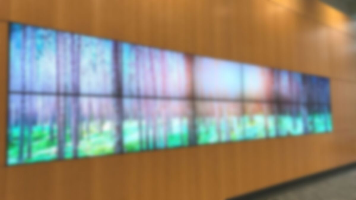 This is a tiled LG 2 by 6 OLED video wall built into the lobby wall of an office tower in downtown Vancouver, BC.