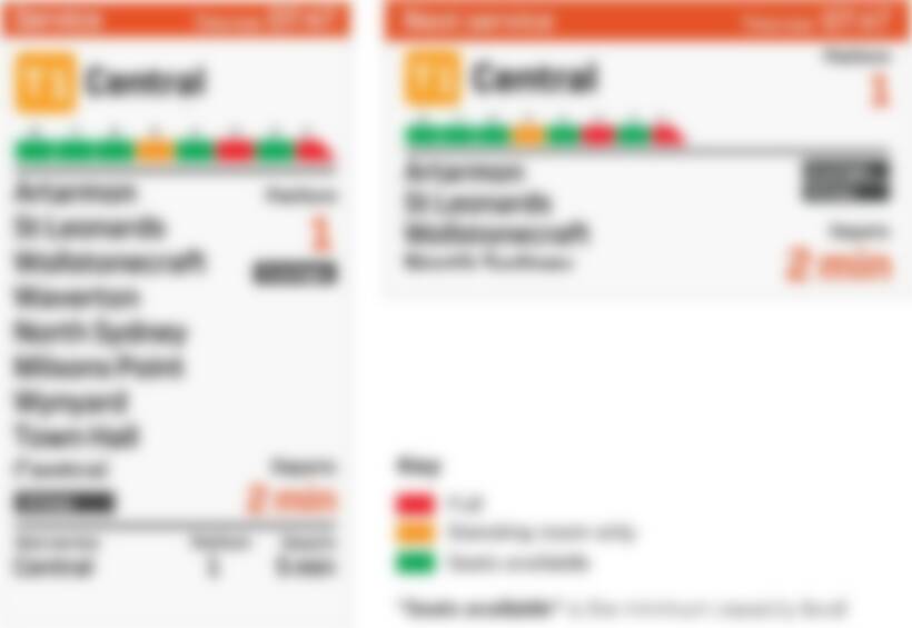 The rail authority, Transport for NSW, now has digital signage on platforms that shows which rail cars have seats available, have standing room only or are completely full.