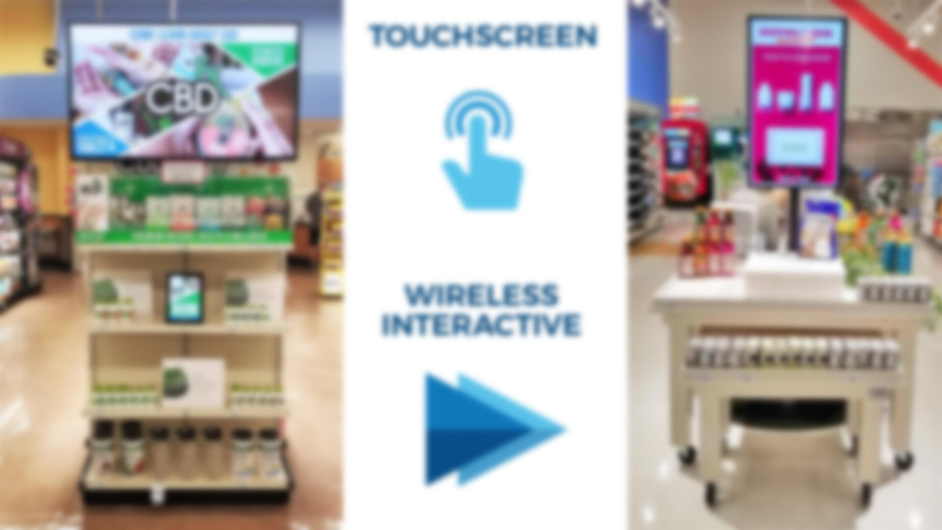 One is a digital end cap marketing what I assume are hemp-based CBD oil products, with the interesting wrinkle that a small tablet is down at waist level to enable interactive and still be ADA compliant (so wheelchair users, for example, can use the set-up). The CBD products are from CBDFx, a skincare company. The tablet controls the content on the display above to learn more about CBD and their products.