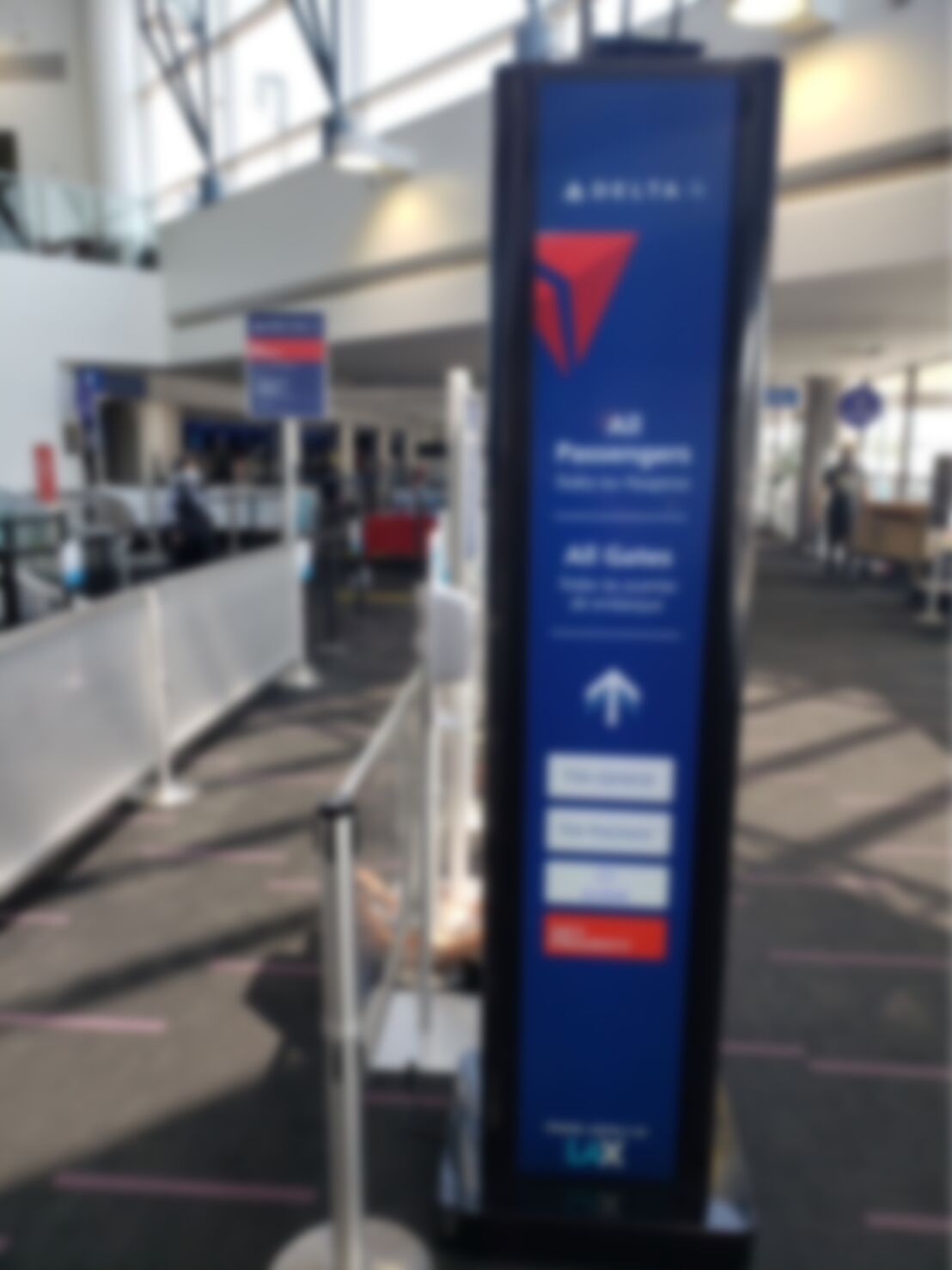 The digital signs are used, in this case at LAX T2, to identify the airline and guide passengers to checkpoints. It can be, presumably, tied into airport information systems to change labeling – like from Delta to Canadian airline partner Westjet.