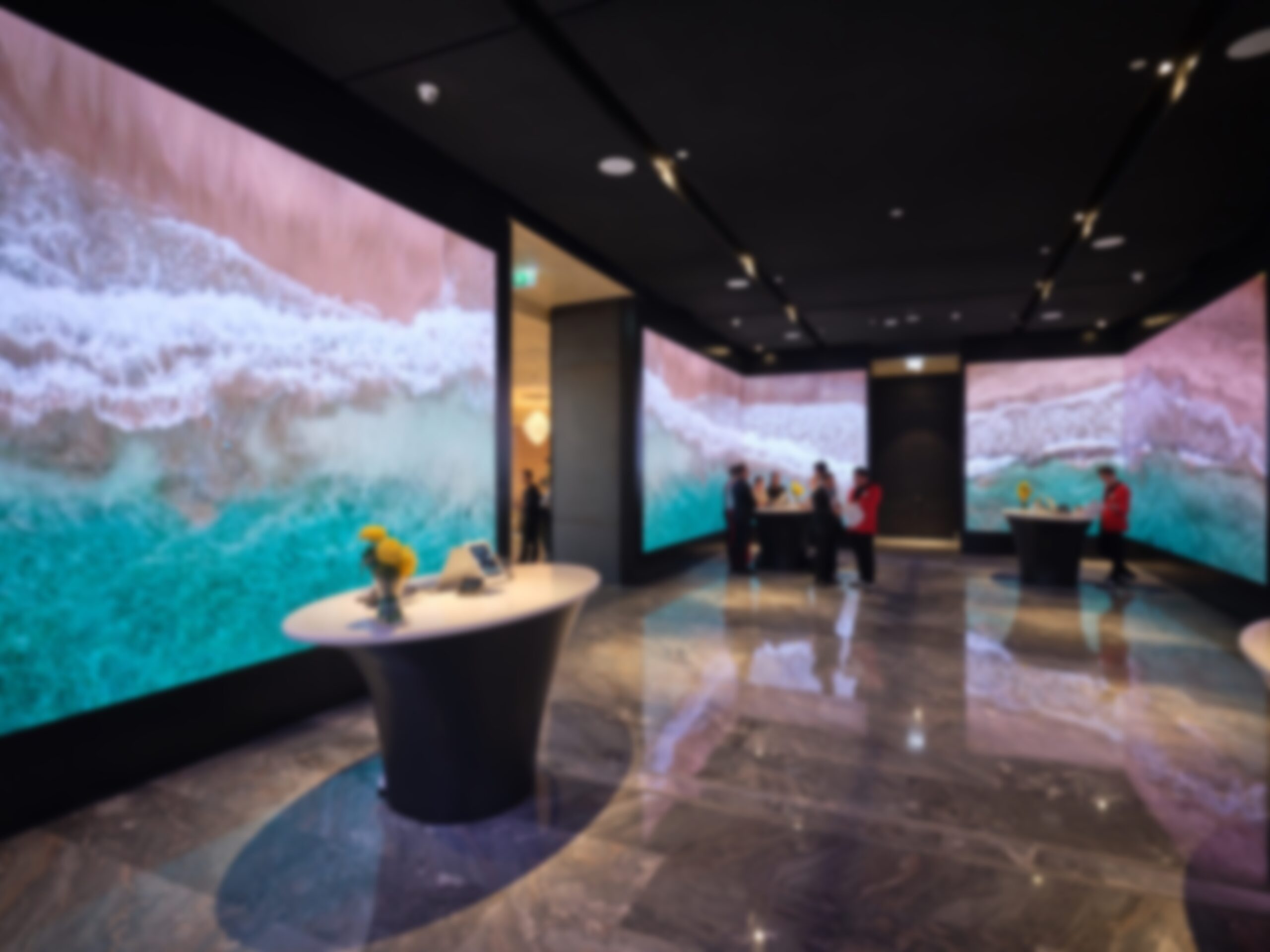 The lobby has big, fine pitch direct view LED lining its walls, running custom created content developed by the LA-based creative shop StandardVision.