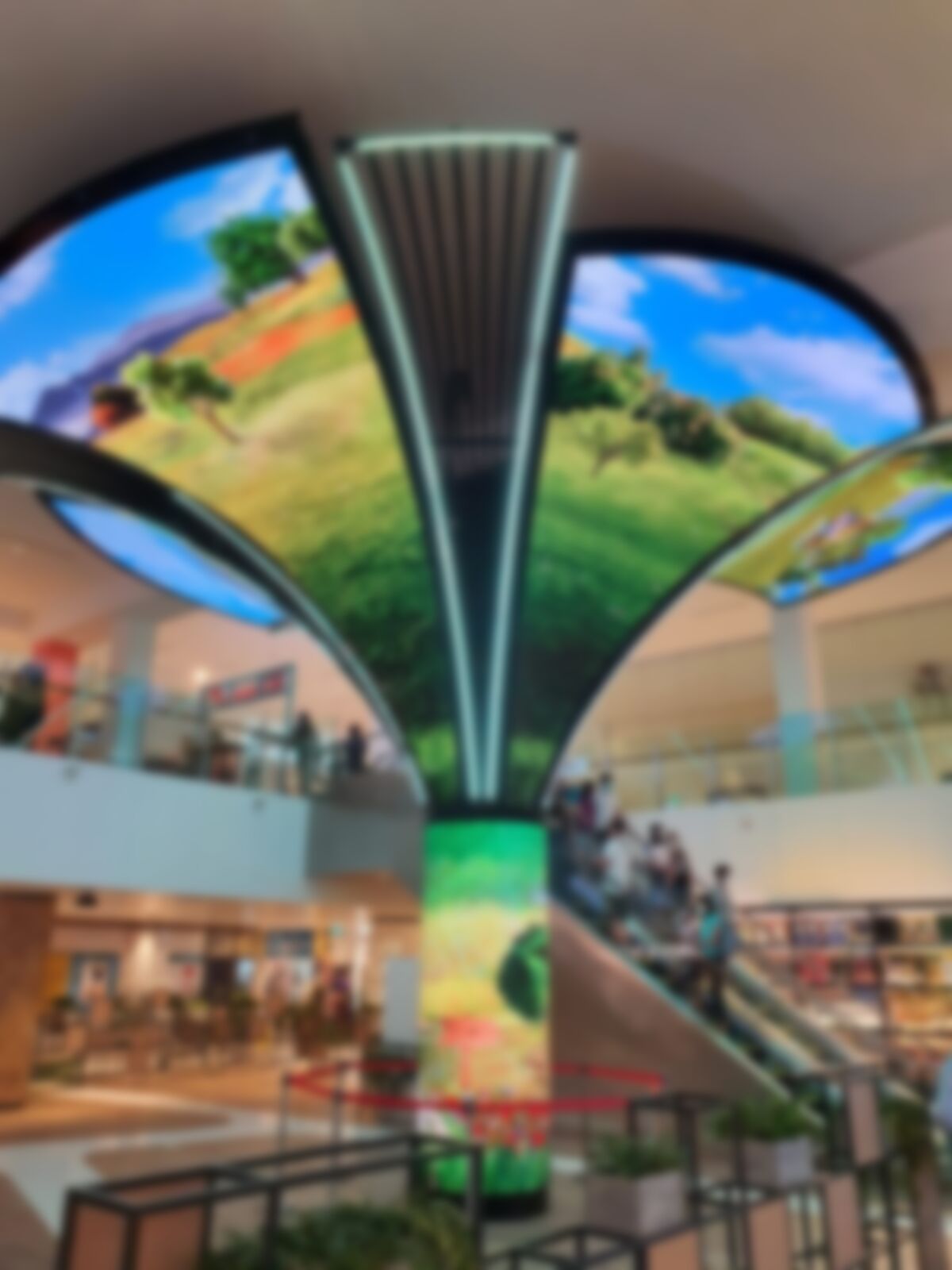 There is a proper architectural term for this shape but I dunno what that term may be, so I will just describe this as a spreading column clad in LED, at a shopping mall in Singapore.