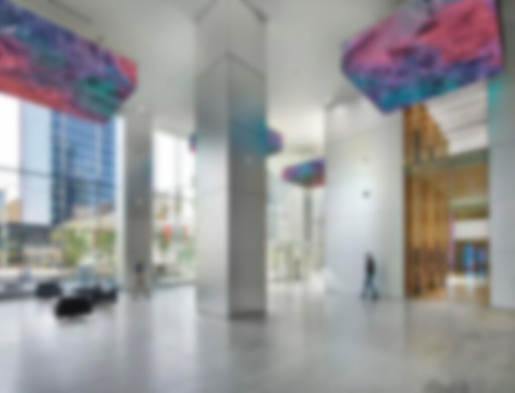 The solution is a set of five-sided LED boxes attached to the lobby ceiling, and visible from the street through the curtain glass facade. The six boxes all have 260-square-feet of LED, and run immersive digital art.