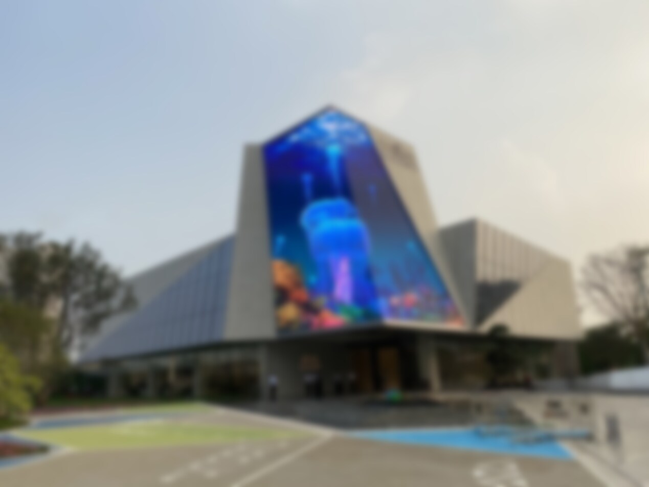 First, a trapezoid-shaped 6mm LED wall of 275 sq. meters makes the building a landmark, particularly when using three-dimensional, anamorphic creative.