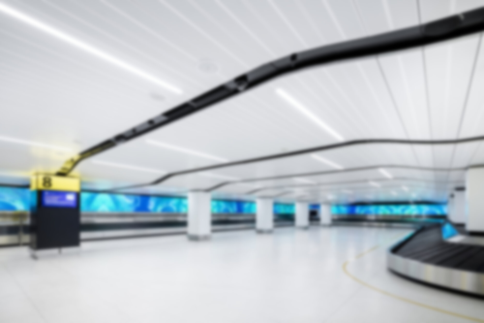 This is the baggage carousel area at the Terminal 2 of Melbourne Airport in Australia – an 85 meter wraparound LED ribbon that greets arriving travelers with digital artwork.