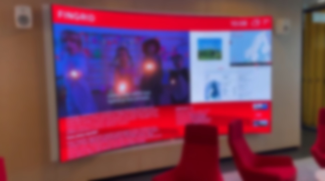 This in the Helsinki lobby of Fingrid. It’s a curved LG DV LED wall, put in by Praecom Group. What I like is how there is a standard flat frame for this video wall, but the curve comes out from it, which I assume is to reinforce visually that the curve is there.