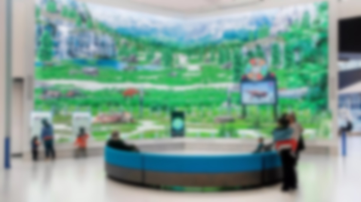 The installation features a series of LED video walls integrated with a bottom row of high-definition LCD touch panels that allow for unlimited, simultaneous touches from fingers, hands for patron to foster interested in STEM (Science, Technology, Engineering and Math) learning.