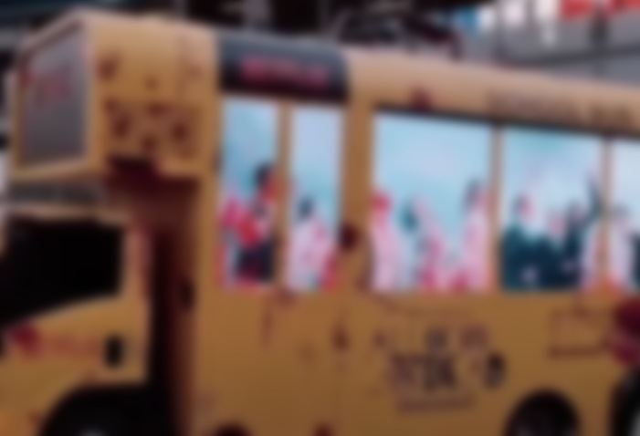 In this case, a cube truck has been modified to look somewhat like a schoolbus, with LED displays schemed in as the windows. To casual onlookers, it appears the students inside the bus are being shredded by the ravenous undead – complete with splatters of blood on the virtual windows.