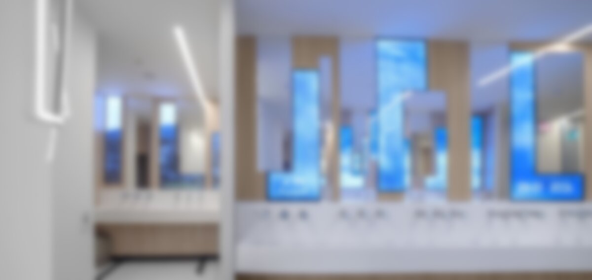 In the washrooms, there are ribbon strips and L-bars that surround sections of the mirrors at the sinks in three washrooms, again with custom content.