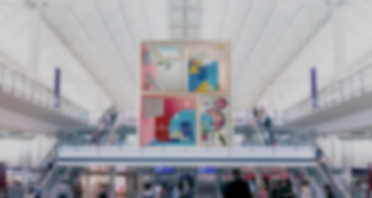Then there are vertical LED ribbons running ambient creative on 17 tall totems along the central concourse, post-security, below the numbers that locate individual gates. It looks like these totems run flight information and timing when the departure gates are in active use, and then presumably revert to the ambient creative when there are no flights assigned to a gate.