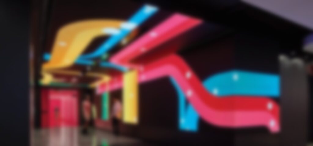 The play of the neon elevator lobbies of L.A., says the brief, have been re-envisioned with LED panels in colors and images representing pizza, yellow cabs, and the Statue of Liberty. In the café, LED tubes abstract the subway map, while, behind the servery counter, climbing ropes reference Spider Man.