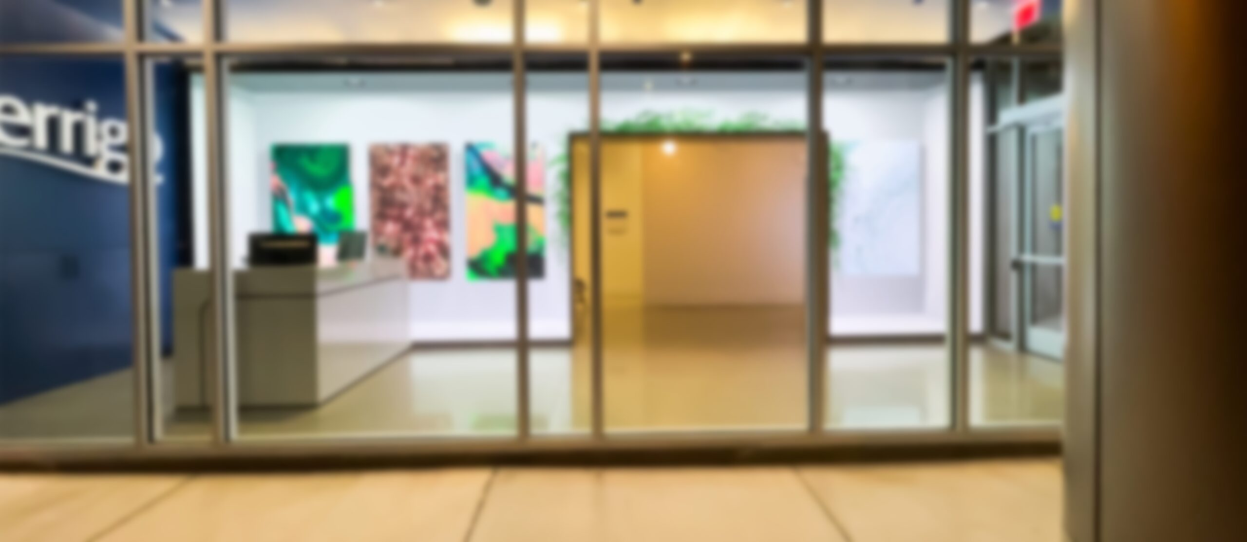 The creative uses depth and shadows, as well as a ceiling with recessed lights, to generate the illusion that the lobby is deeper than it really is, and has digital artworks on its feature wall.