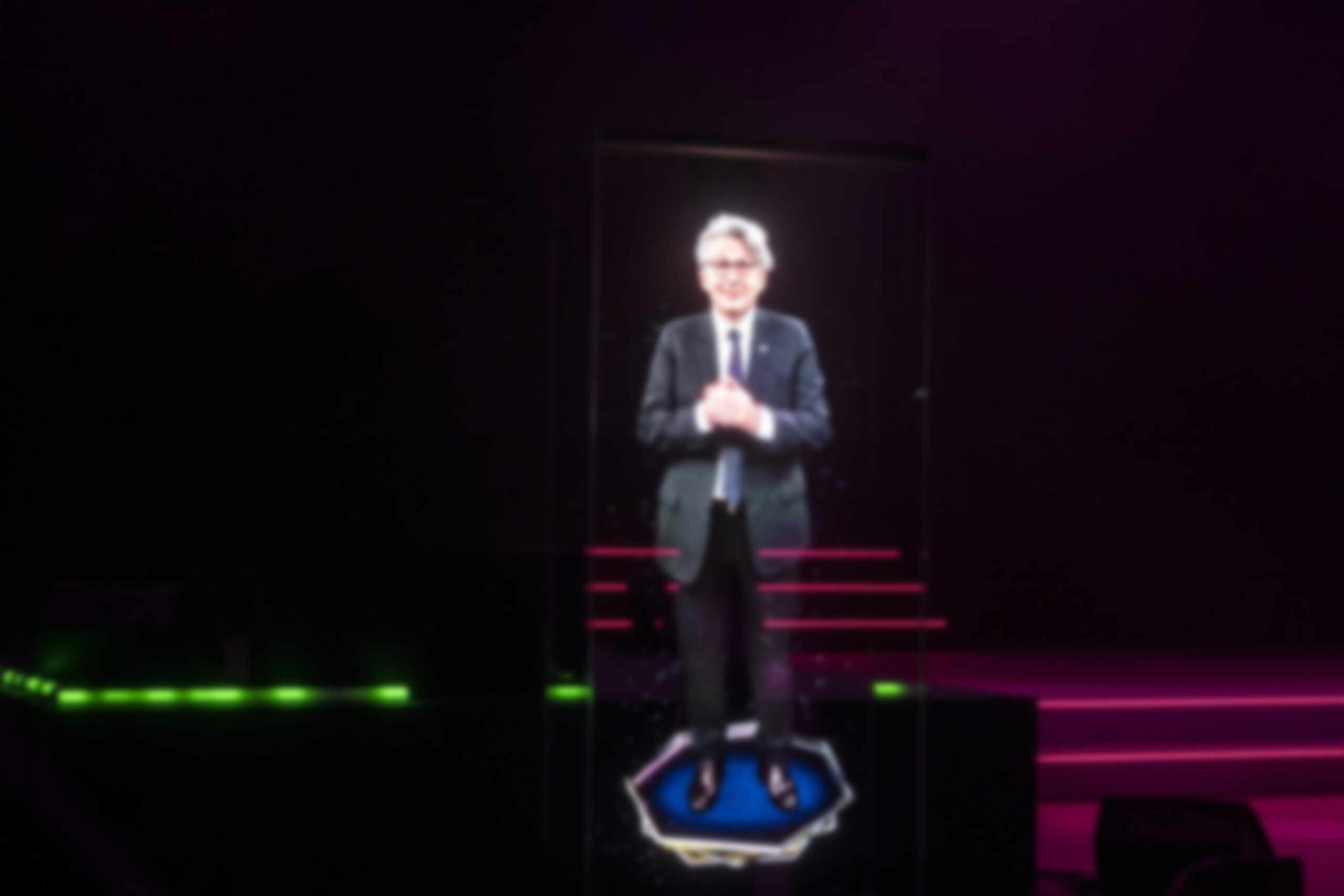 I mention this because what’s visually interesting here is the way the LED light stick array enables the visuals to float and overlay the background. So Breton would materialize on the stage and attendees could see behind him, versus the shower stall set-up where the person appearing does look very much contained in the enclosure. It’s arguably more natural, though the light sticks are in a clear acrylic case (so no one is relieved of fingers or nose tips), and the generated images are softer – because they come from the spinning blades and not a fixed surface like a liquid crystal display.