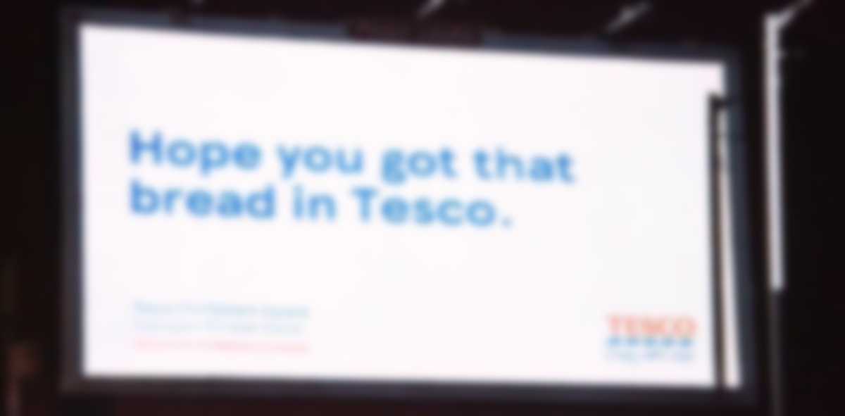 The awareness campaign for a new Tesco Express c-store in the Charlemont Square uses high-bright projection to push messages to a blank static billboard that people can see from the sidewalk, with a copywriter from a Dublin agency in the immediate area observing foot traffic, and customizing the messages to the people or groups passing through.