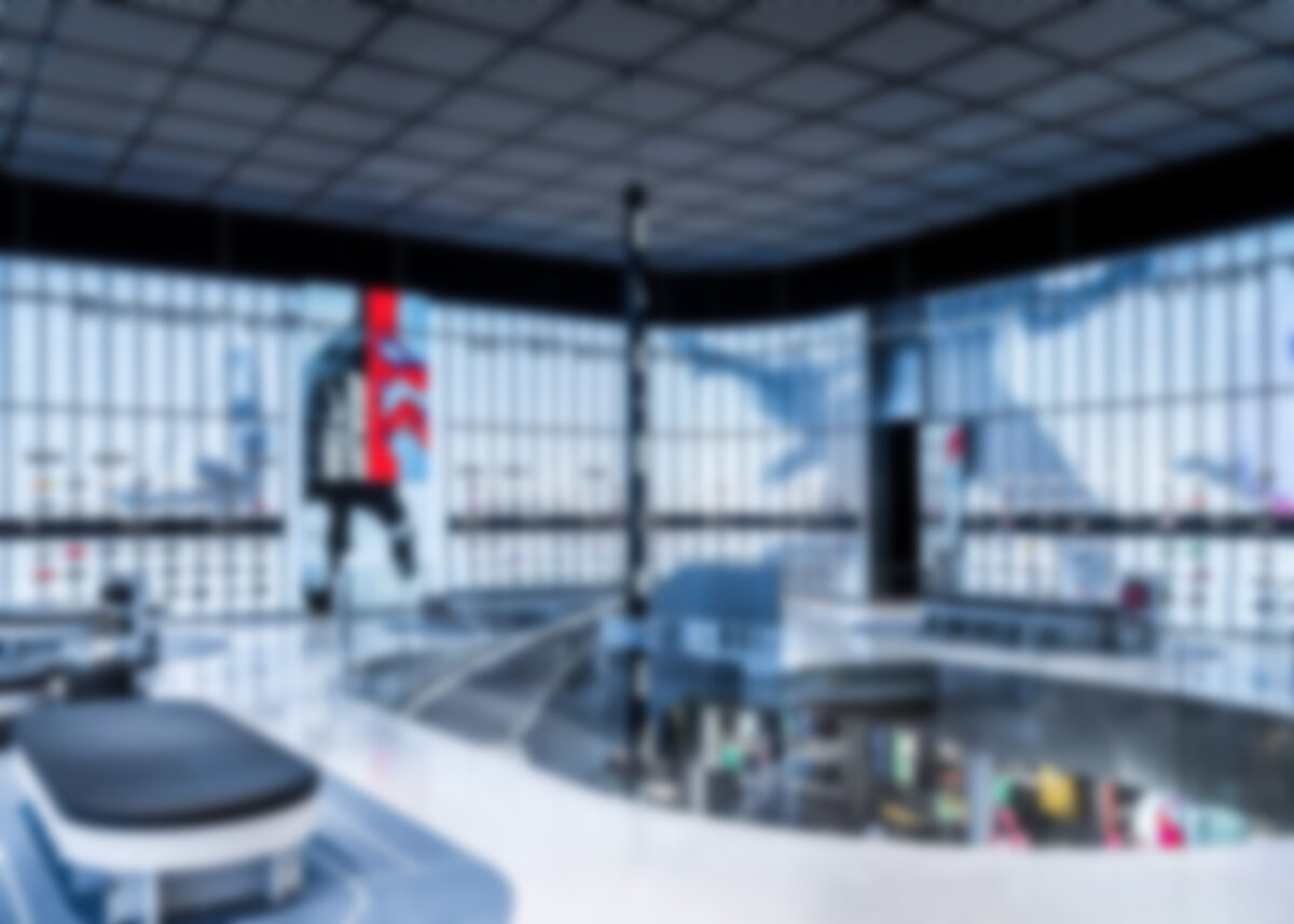 The store has LED tickers, big product and branding displays and LCDs behind the countyer, as is the case with many to most larger footprint Nike stores. But I’m making an assumption that the big visual feature uses a visual trick I’ve seen a few times – some sort of diffusion layer in front of the LED wall that softens the images (and usually allows the store designers to use lower resolution, less costly LED tech).