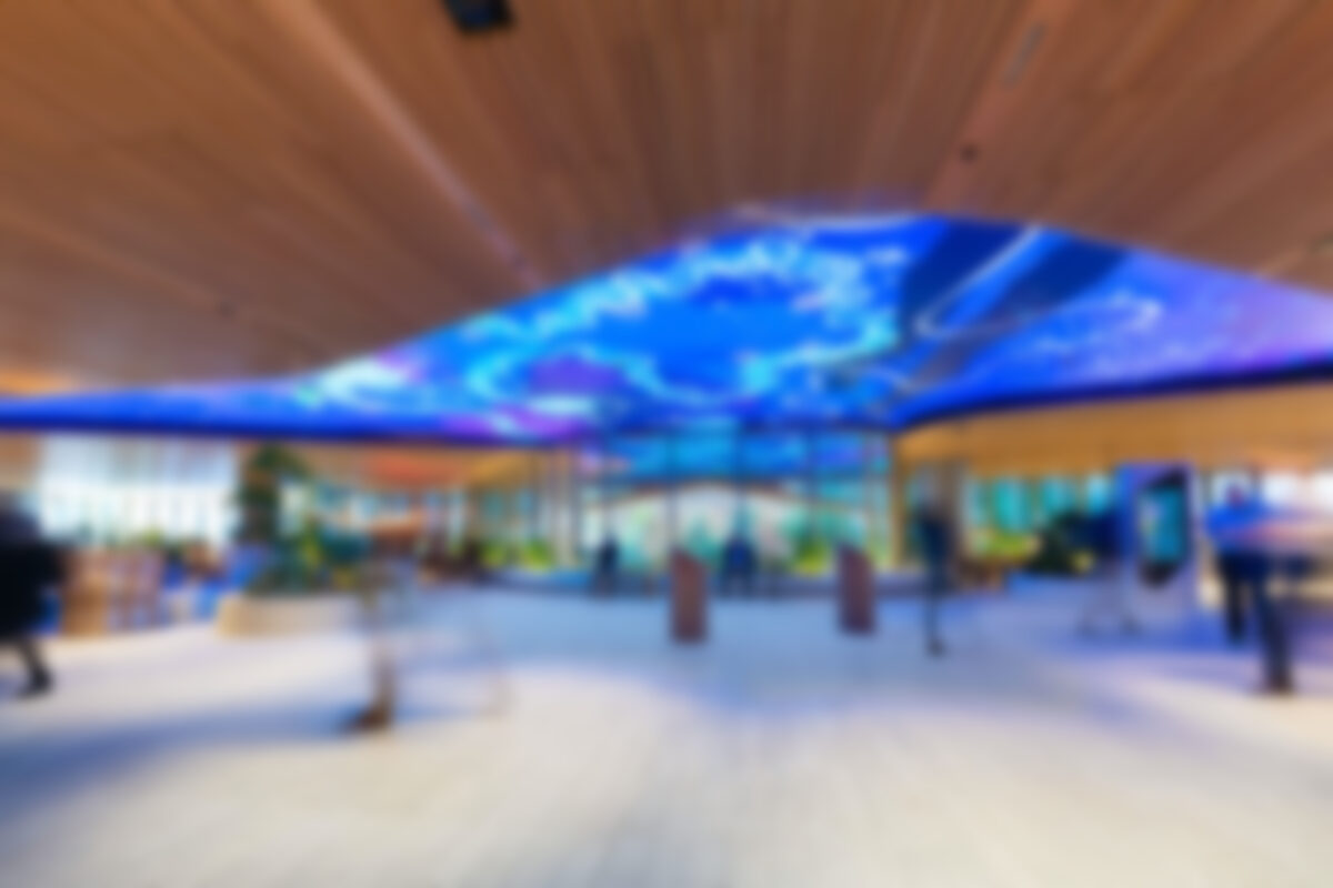 No technical details, but this is digital and there is motion – so it is almost certainly an LED canopy with an interesting, curvy shape framed a ceiling that is otherwise wood slats.