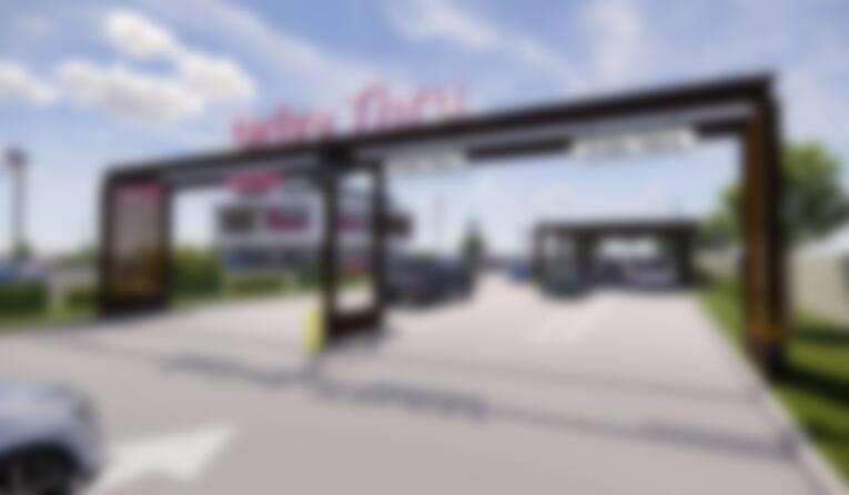 QSR magazine reports that the Atlanta company will open a new restaurant in its home city next year that has a four-lane drive thru set-up that addresses conventional order-at-the-screen processes in two lanes and order-ahead, pick-up on site motorists in the other two. They all roll through a covered canopy, with the kitchen up above on level two. The set employs some sort of “food transport system” to get the finished orders to the lower level, where staffers hand off branded bags to waiting motorists.