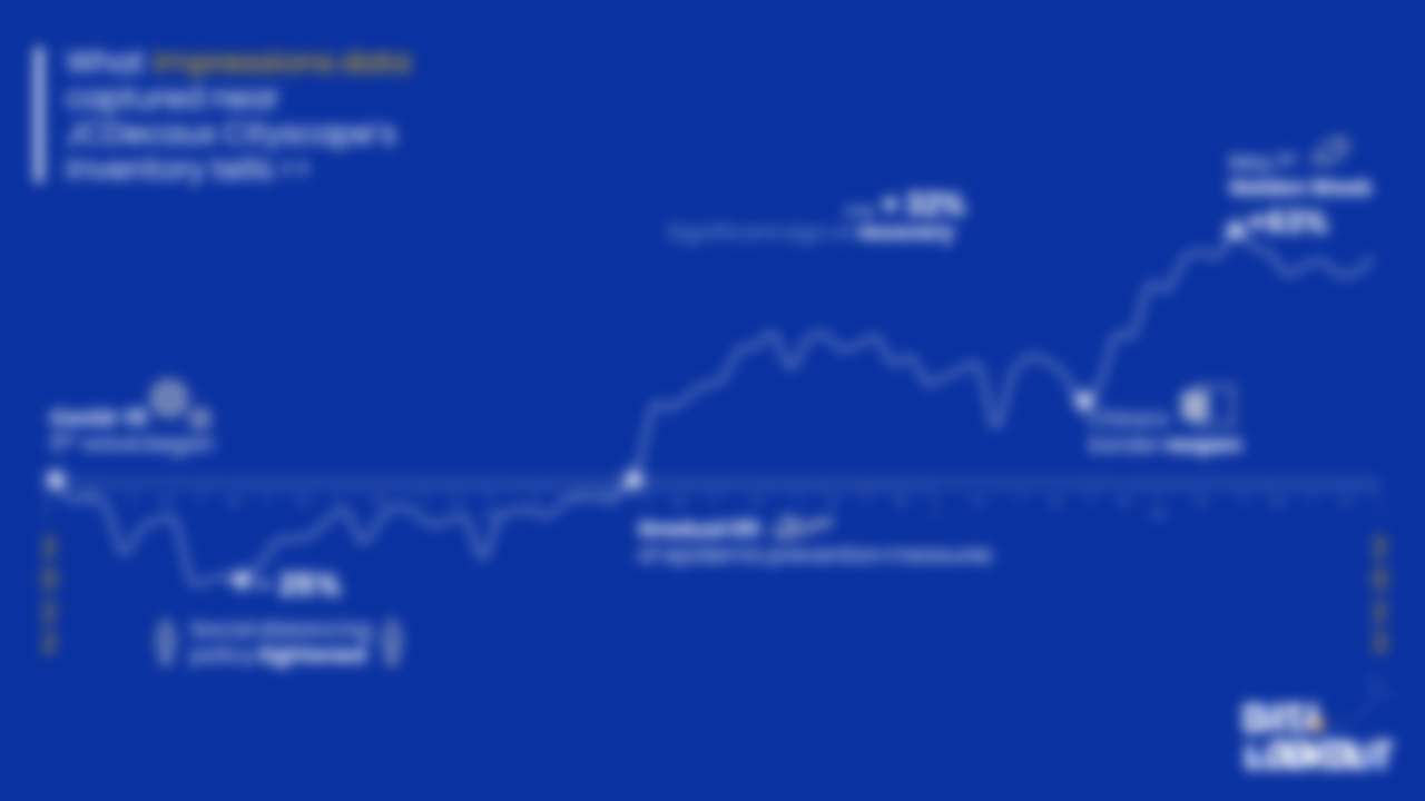 Just as the situation began to recover in Q4 2021, arrival of the 5th wave in Q1 2022 caused a 25% decline on Cityscape’s OOH impressions* trend during February to March in comparison to 2022 weekly average (JCDecaux Hourly Impressions Measurement data solution).